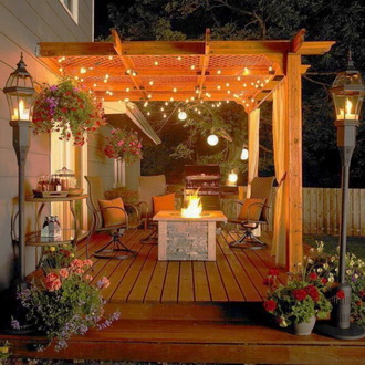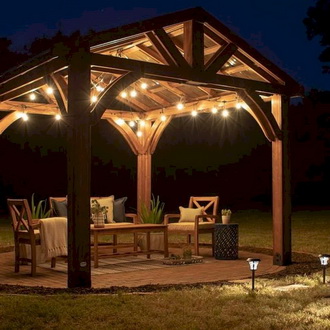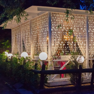 Pro vytvoření romantické atmosféry v altánku můžete zavěsit girlandy a umístit svíčky. Girlandy s nízkým výkonem a ve velkém množství jsou vhodné nejen pro Nový rok, jsou levným a efektivním způsobem, jak osvětlit altán a vytvořit tam slavnostní náladu. Teplé světlo dodá útulnost, studené světlo častěji volí milovníci minimalismu. A pokud je pro vás těžké si vybrat mezi přirozeným a LED osvětlením, umístěte na stůl v altánku svíčky, abyste mohli scénáře osvětlení střídat podle nálady.