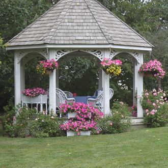 Pro takové altány je lepší zvolit bílé nebo pastelové barvy, ale střecha může být kontrastní.