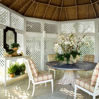 Vaše pohodlí přímo závisí na tom, jak pečlivě vybíráte nábytek. Hoďte polštáře a přehozy na pohovky a židle, abyste vytvořili útulnou atmosféru. A uprostřed altánu je docela možné umístit akcentní koberec – udá tón celému prostoru.