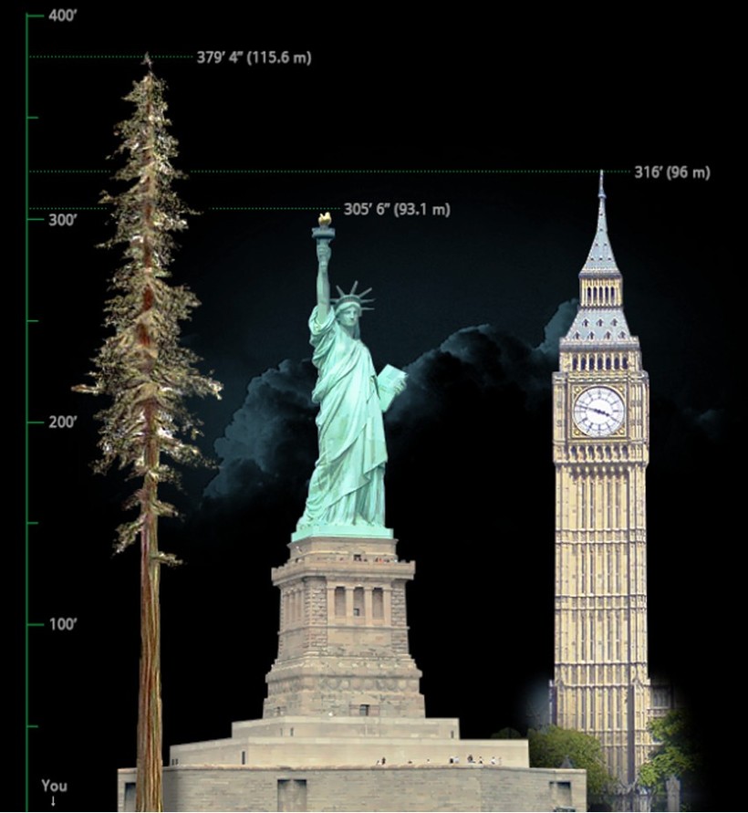 - National Geographic Society (NGO) byla poměrně dlouho v čele seznamu nejvyšších stromů na světě, ale na konci 20. století našli botanici mezi jeho stálezelenými protějšky nádhernější exempláře, a přestože strom stále roste ( 112,71 m), jeho místo v seznamu kleslo. Lauralin je dalším příkladem nádherných sekvojí v parku Redwood Creek. Jeho výška je 113,03 m a vědci určili jeho stáří na 1600 let. Dlouhověký strom se cítí skvěle a vůbec netrpí množstvím turistů, kteří neustále procházejí po turistických trasách.