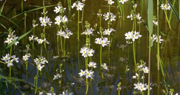 - Vodokras. Úhledná a nenáročná rostlina. V červenci zdobí jezírko malými bílými květy, které vypadají výhodně na pozadí zelených listů. Na rozdíl od jiných zástupců roste Vodokras pomalu a nezabírá mnoho místa, takže je ideální pro malé vodní plochy. Někteří lidé si myslí, že rostlina je schopna barvit vodu, na základě názvu, ale ve skutečnosti akvarel znamená „zdobící vodu“.