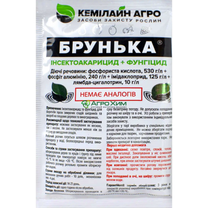 Kontaktně-systémový fungicid Brunka je nejúčinnějším a rychle působícím lékem, který úspěšně bojuje s projevy plísňových onemocnění, všemi druhy infekcí a také zabraňuje infekcím přezimováním parazitů. Už vás nebaví nekonečné choroby zahradních plodin? Už vás nebaví sklízet špatnou úrodu a marně zpracovávat stromy a keře? Brunka vám pomůže se s těmito problémy vyrovnat, a to bez extra námahy a nervů! Droga působí šetrně na plodiny, přičemž velmi agresivně bojuje proti chorobám a škůdcům. A se správnou léčbou můžete na infekce a plísně navždy zapomenout!